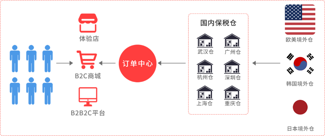境外商品入境暂存保税区,消费者购买后以个人包裹,通过国内物流送达境内消费者