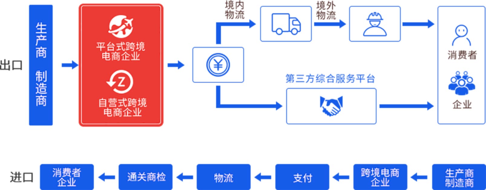 从跨境电商的出口流程看,生产商或制造商将生产的商品在跨境电商企业的的平台上展示,在商品被选购下单并完成支付后跨境电商企业将商品交付给物流企业进行投递,经过两次(出口国和进口国)海关通过商检后,送达消费者或企业手中。也有的跨境电商企业直接与第三方综合服务平台合作,让第三方服务平台代办物流、通过商检等系列环节从而完成整个跨境电商的交易过程。跨境电商进口流程除了与出口流程的方向相反外,其他内容基本相同