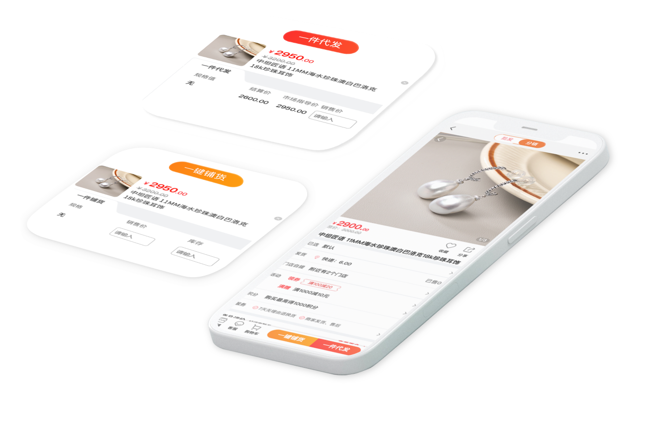 S2B2C系统支持供货商设置商品起批量、多级批发价格,零售商进行批发采购或一键铺货、一键代发商品到自己的店铺,同时支持零售商销售自己的商品