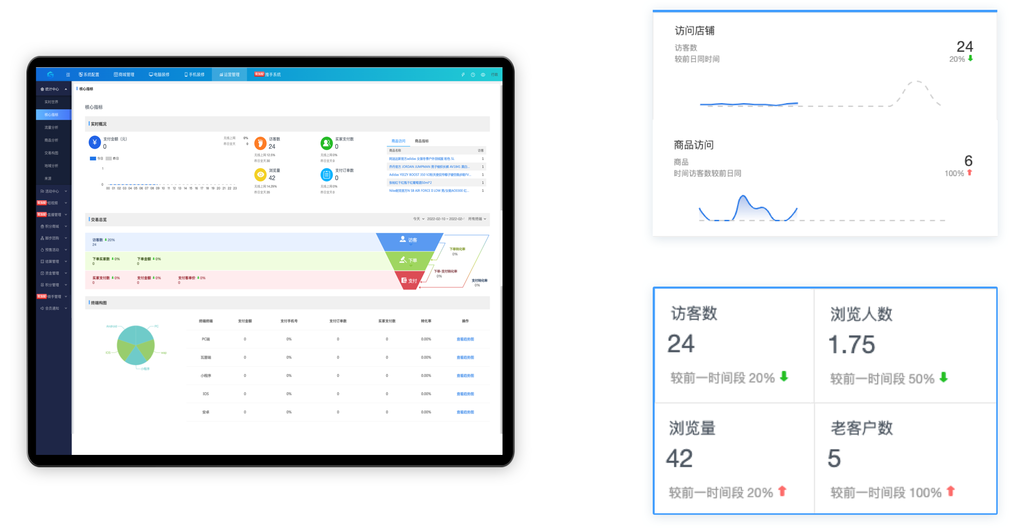 多方面了解商城经营数据,消费者行为数据,用于调整策略参考,更有实时交易数据监控,帮助你快速发现数据之间的联系及背后的价值,多方面分析, 让你轻松把握商业趋势,及时应对变化